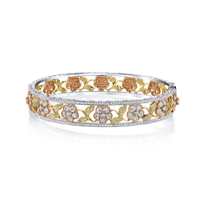 This exquisiste floral bangle features 4.45 ctw of round brilliant cut diamonds and intricate hand...