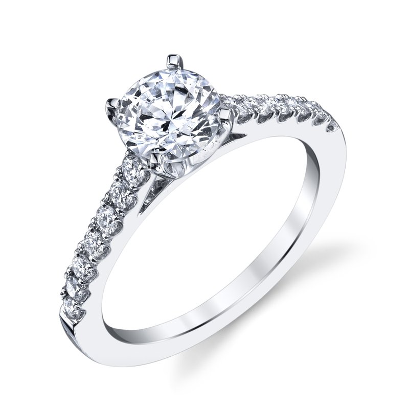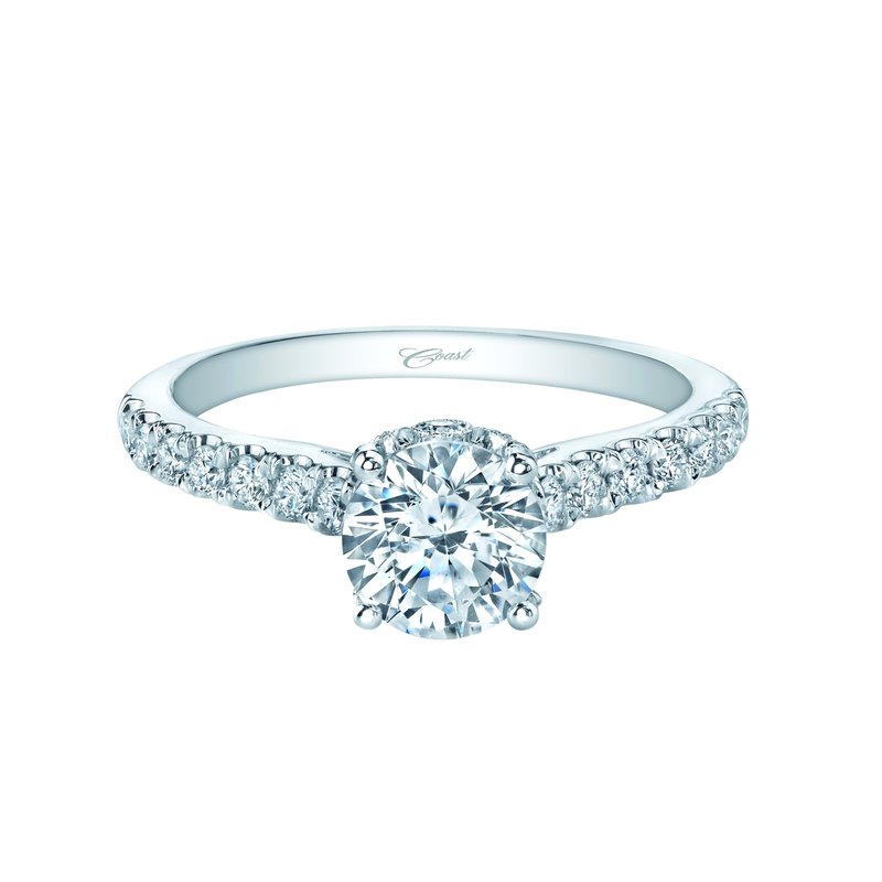 A timeless engagement ring featuring a four prong crown. Sparkling microprong diamonds on the shoulders...
