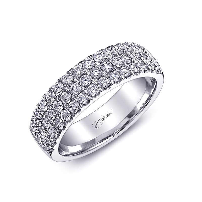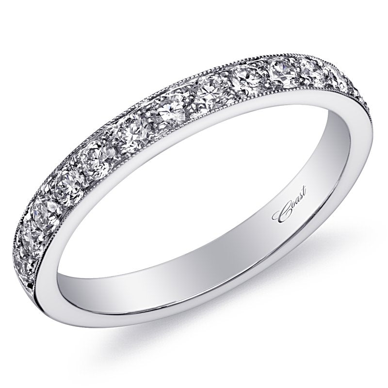 This elegant wedding band features fine pave set diamonds across the top half of the...