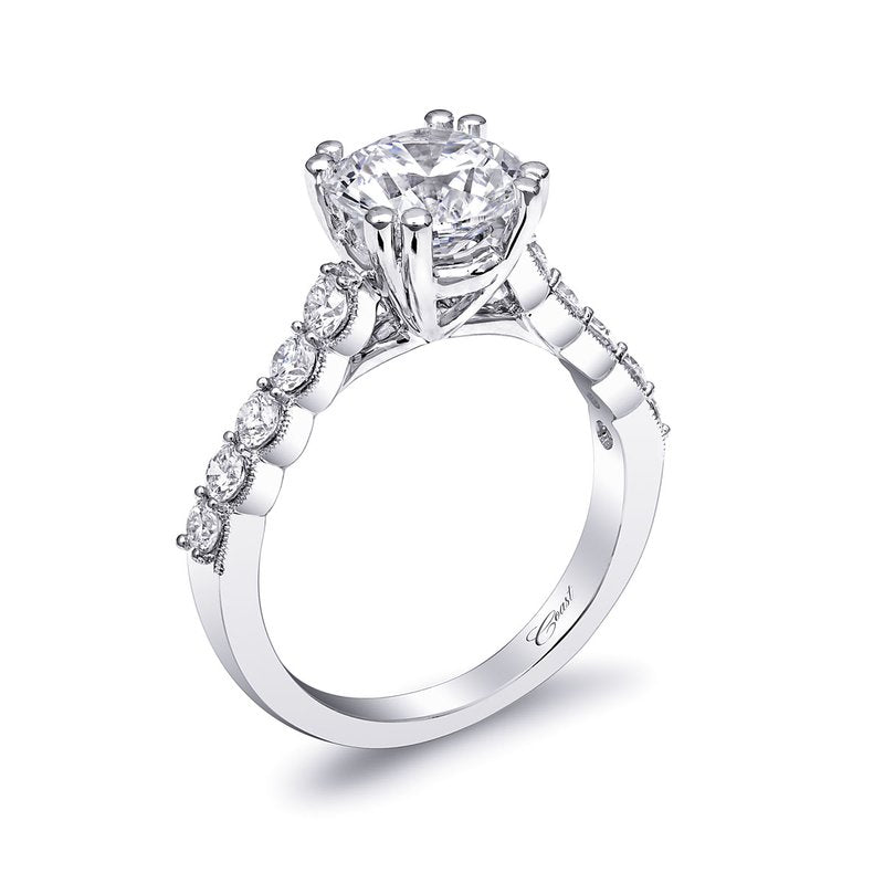 A regal design, this engagement ring features prong set diamonds down the shoulders of the...