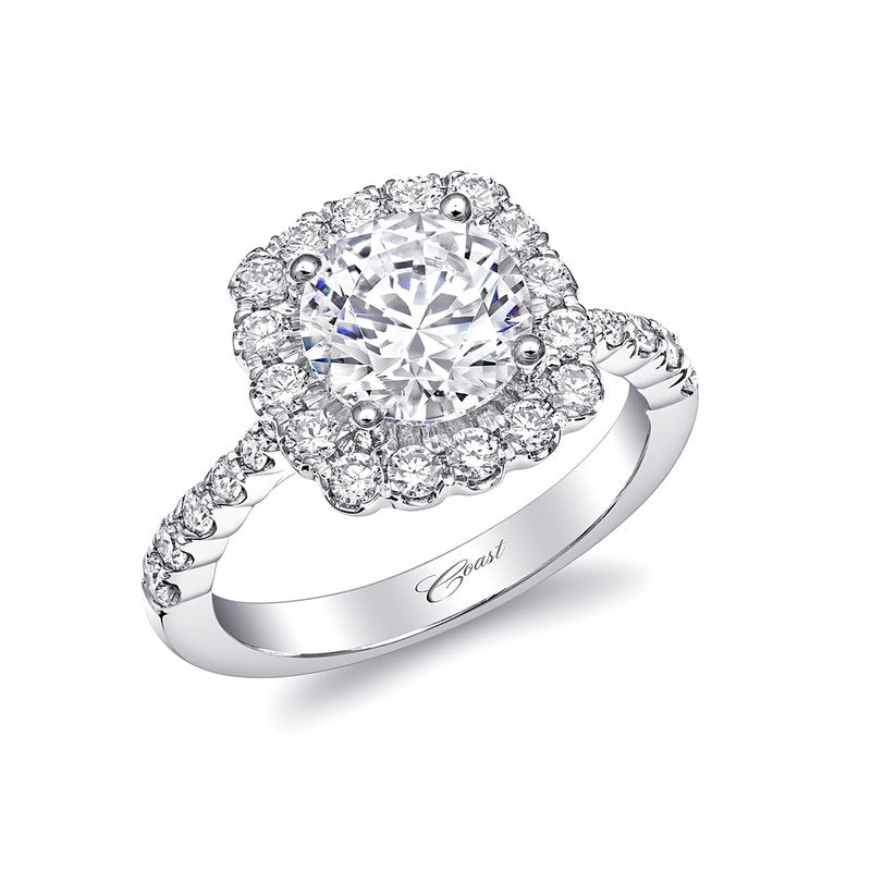 This beautiful engagement ring features a cushion shaped diamond halo, which frames a 2 ct...
