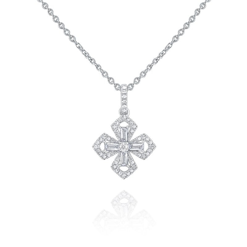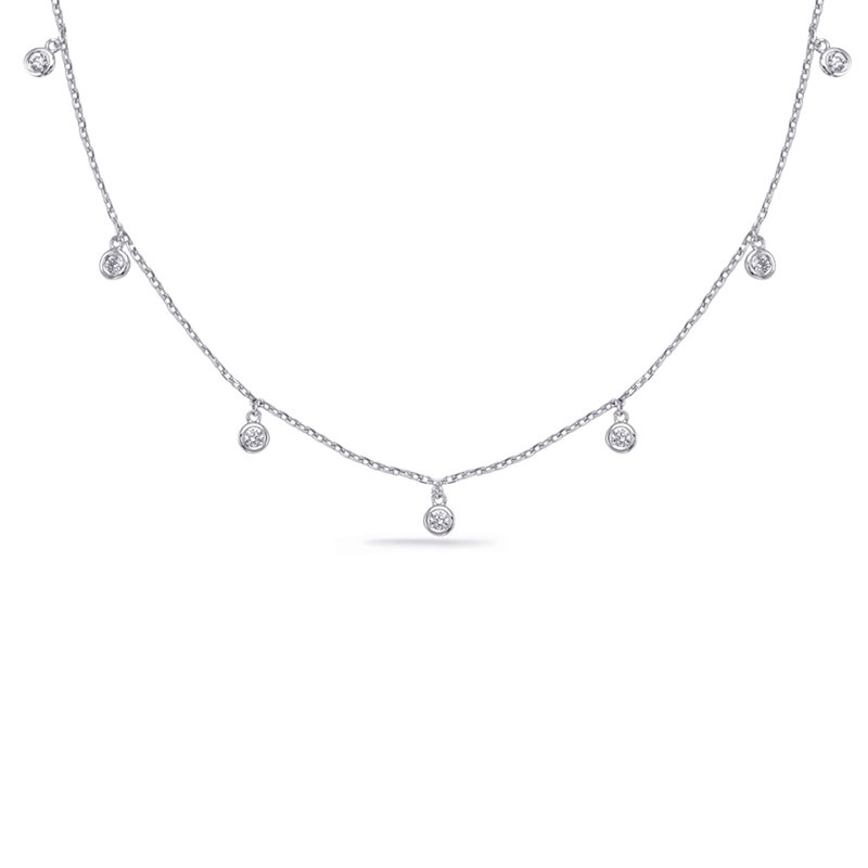 This necklace is available in 14K White Gold. There are a total of 30 stones....