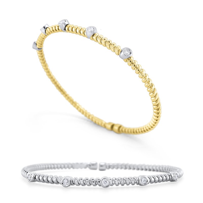Our little twist on a gold and diamond bangle - wear it solo or stacked...