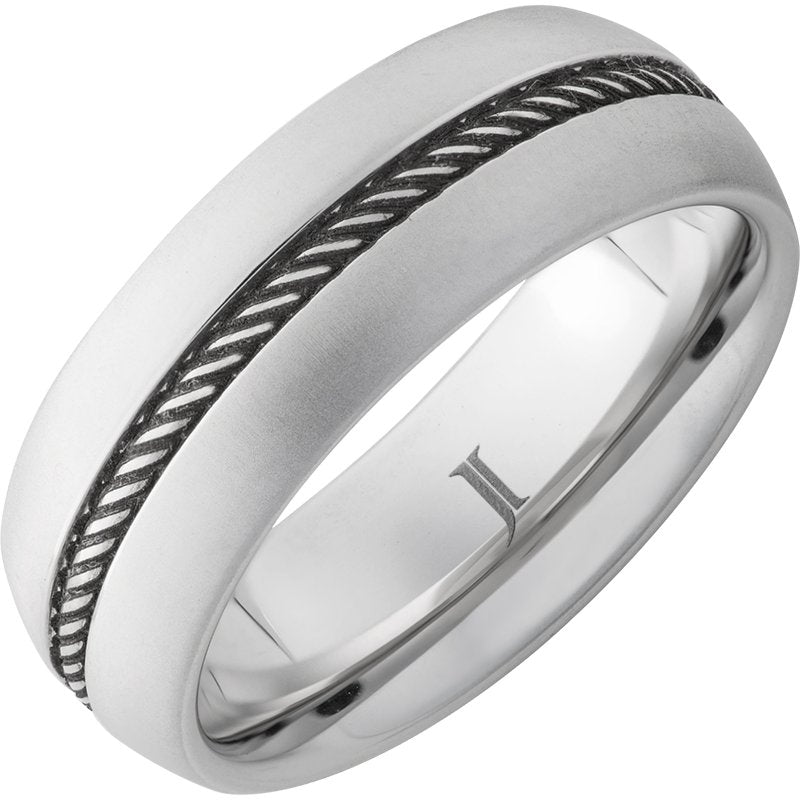 A polished inlay of beautiful Desert Iron Wood gleams from this domed Aerospace Grade Titanium...