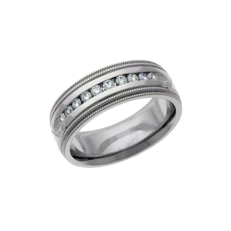 7 mm wide/Flat/14K Rose Gold band with an arrangement of 9, .05 carat Round Diamond stones in a Channel setting.