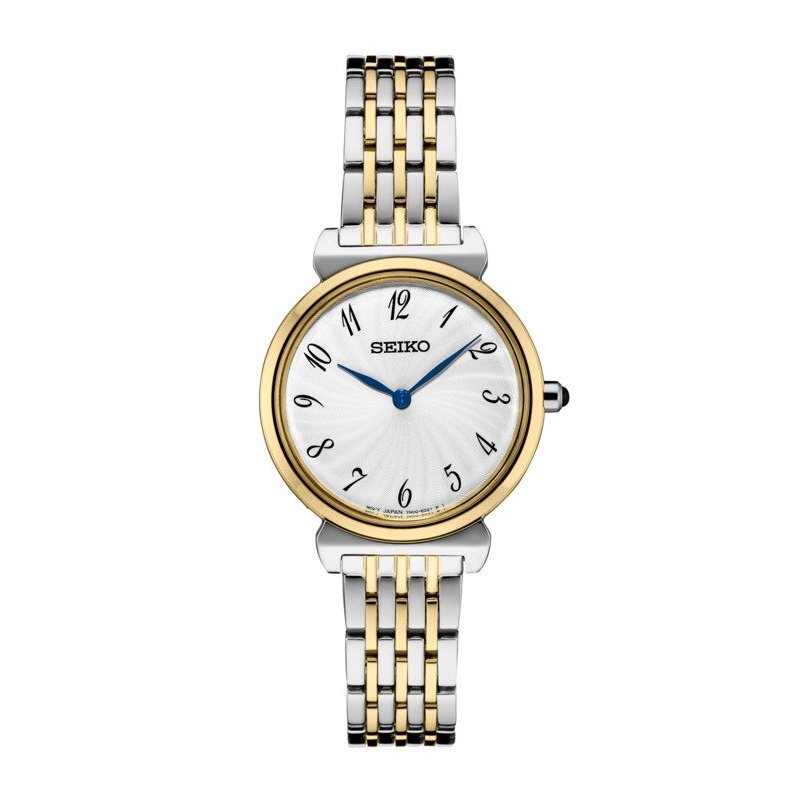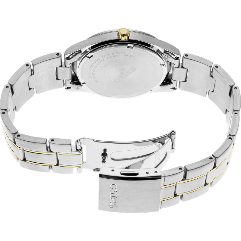 Silver patterned dial with Arabic numeralsBlue hour and minute handsCabochon crownCase diameter: 29.6mmTwo-tone stainless steel...