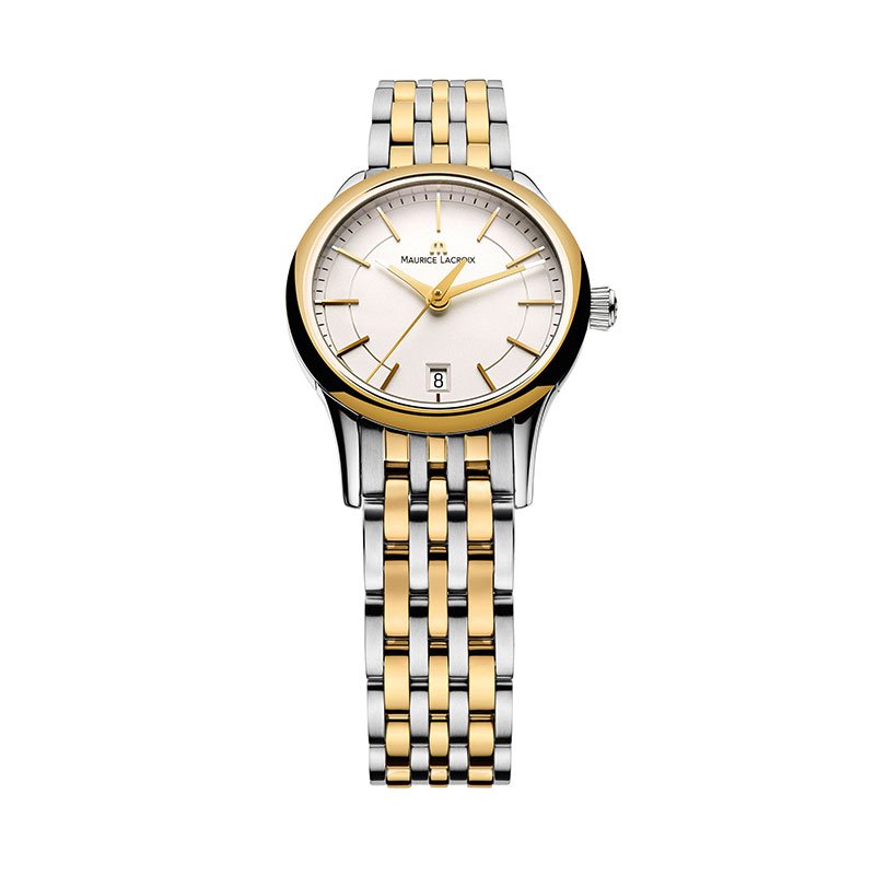 Gold-tone stainless steel case and bracelet with a champagne dial featuring eight diamonds set on...