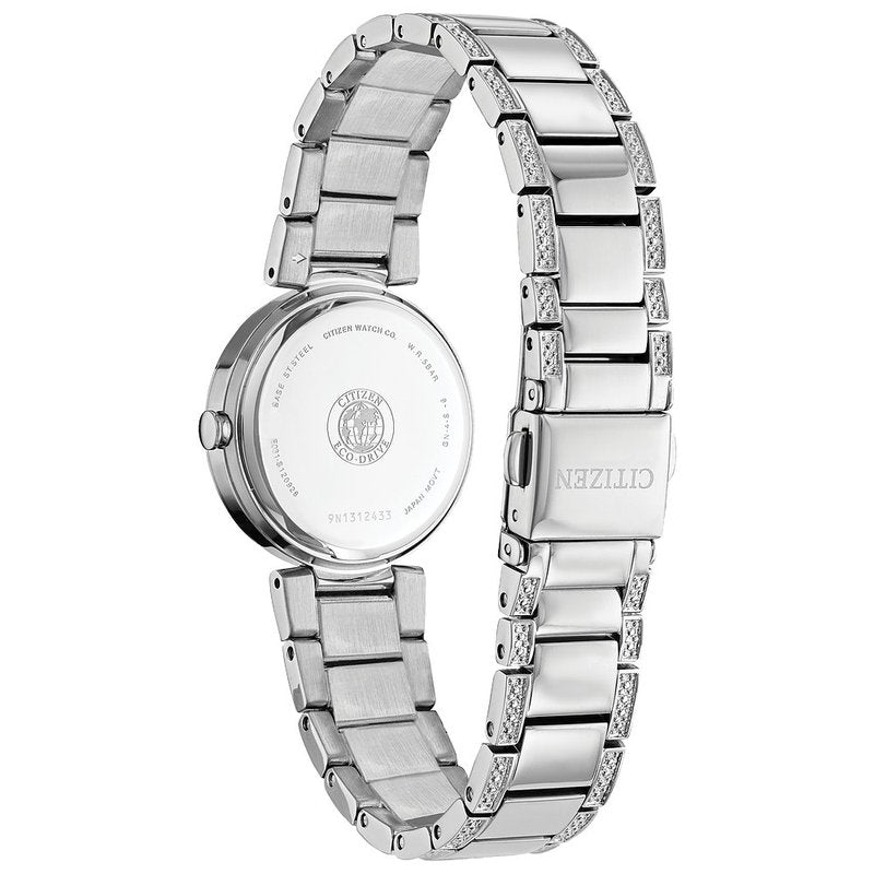 Citizen’s Ladies Crystal timepiece with patented Eco-Drive technology features a stainless steel bracelet inset with...