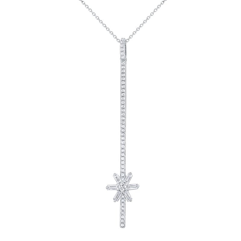 A combination of baguettes and rounds forming a flower anchor a slender diamond stick pendant.