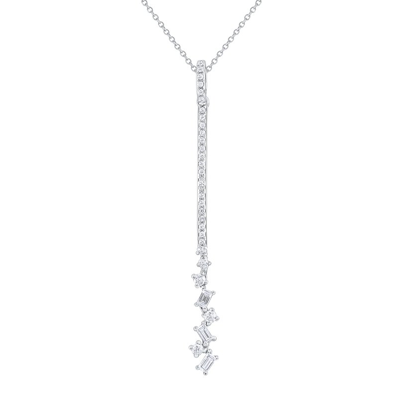 A combination of baguettes and rounds anchor a slender diamond stick pendant.