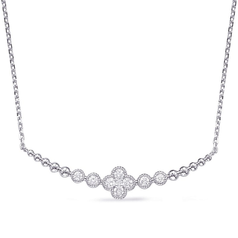 This necklace is available in 14K White Gold. There are a total of 9 stones. There are Rounds with a total carat weight of 0.3 set in a Bezel Set|Micro Prong setting.None