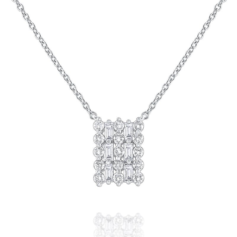 14k Gold Rectangle Necklace accented with round and baguette diamonds.