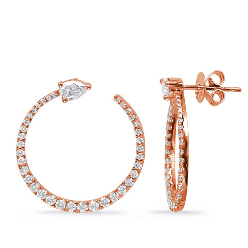 This earring is available in 14K Rose Gold. There are a total of 74 stones. There are Pear Shape with a total carat weight of 0.5 set in a Prong Set setting. There are Rounds stones with a toal carat weight of 1.03 set in a Prong Set setting.None