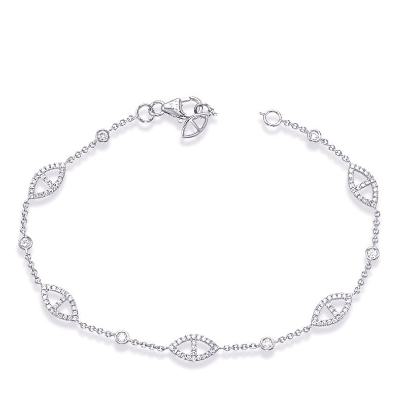 This Bracelet is available in 14K White Gold. There are a total of 121 stones. There are Rounds with a total carat weight of 0.45 set in a Micro Prong setting.None
