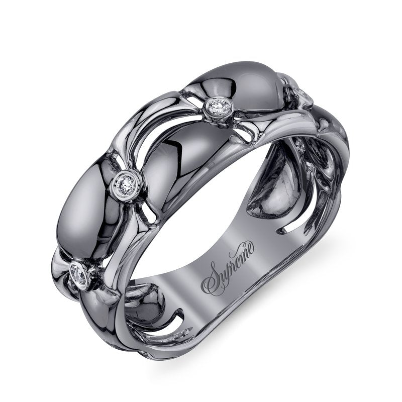 This simple attractive band features .03 ctw of bezel set round brilliant cut diamonds with a black rhodium finish.