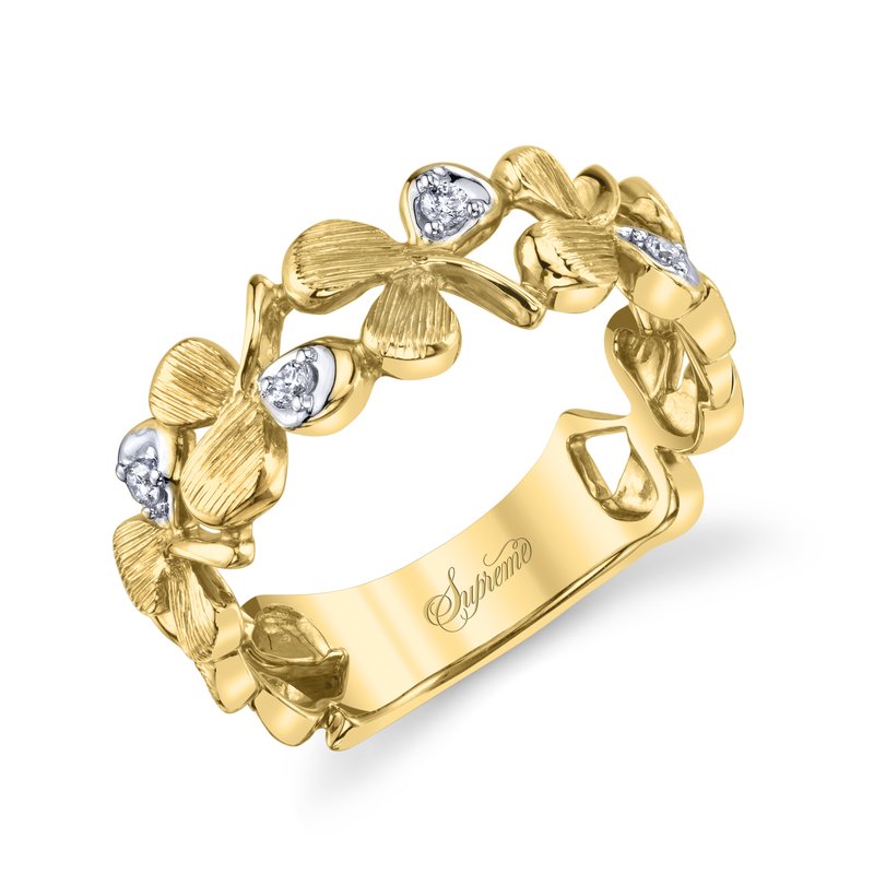 This 3 leaf clover band features .05 ctw of round brilliant cut diamonds.