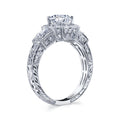 This luxurious engagement ring features .93 ctw of round brilliant cut diamonds and 2 flattering tapered baguettes, with milgrain and hand engraving to enhance the design.