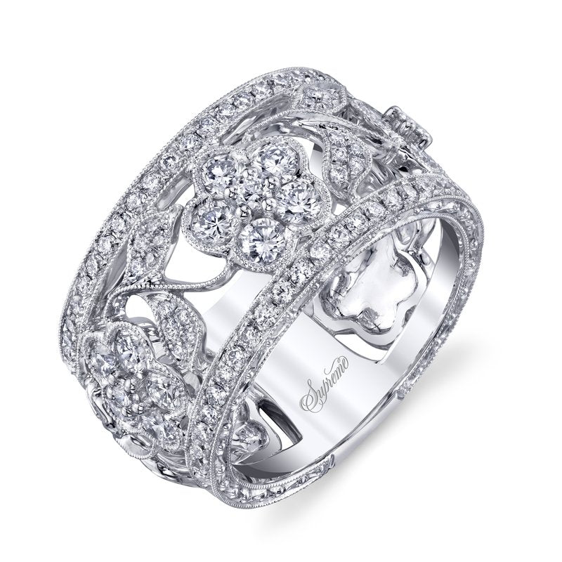 This exquisite floral band features 1.60 ctw of round brilliant cut diamonds with intricate hand engraving and fine milgrain details.