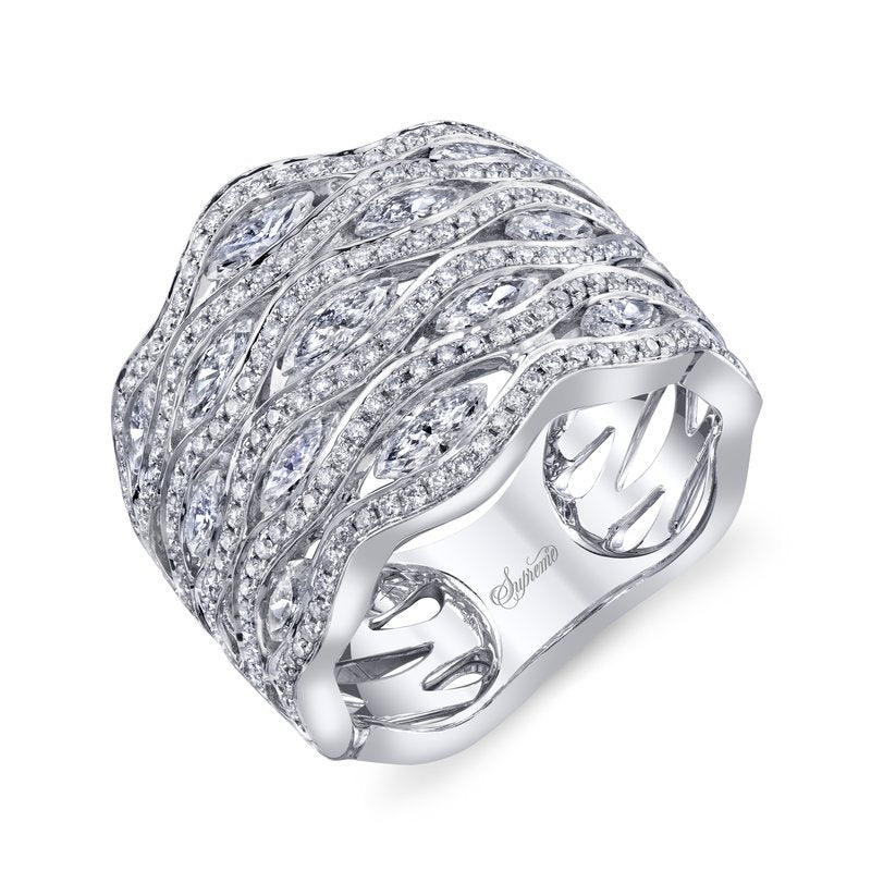This exceptional band features 2.00 ctw of fine channel set marquise cut diamonds and pavé set round brilliant cut diamonds.
