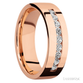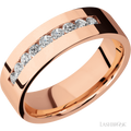 7 mm wide/Flat/14K Rose Gold band with an arrangement of 9, .05 carat Round Diamond stones in a Channel setting.