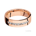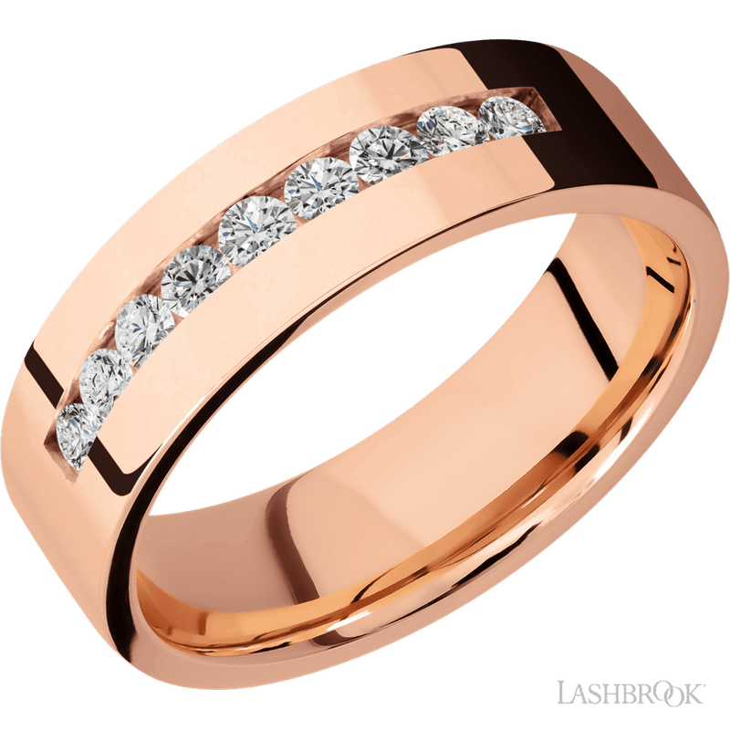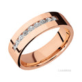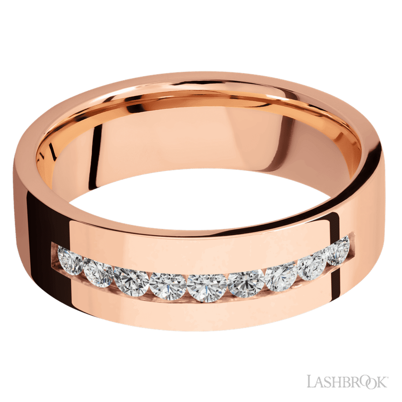 14KR7FDIA9X.05CH-P 7 mm wide/Flat/14K Rose Gold band with an arrangement of 9, .05 carat Round Diamond stones in a Channel setting.