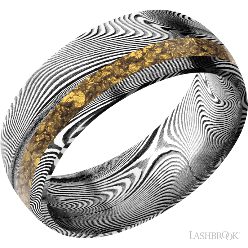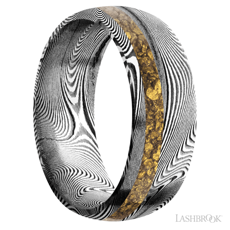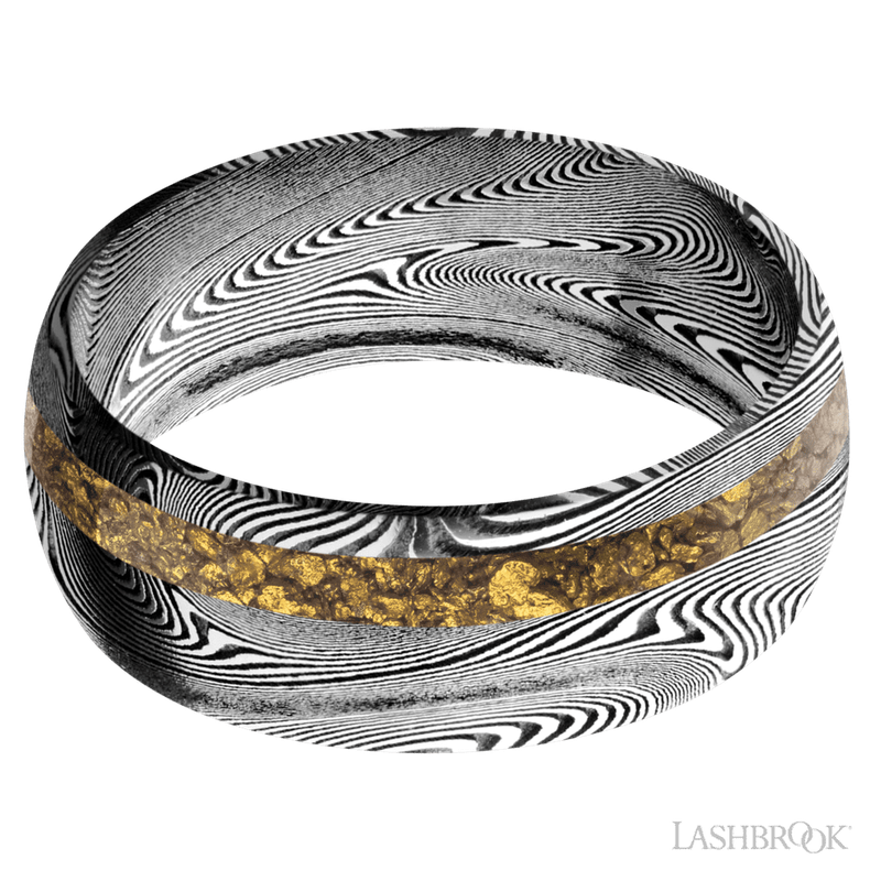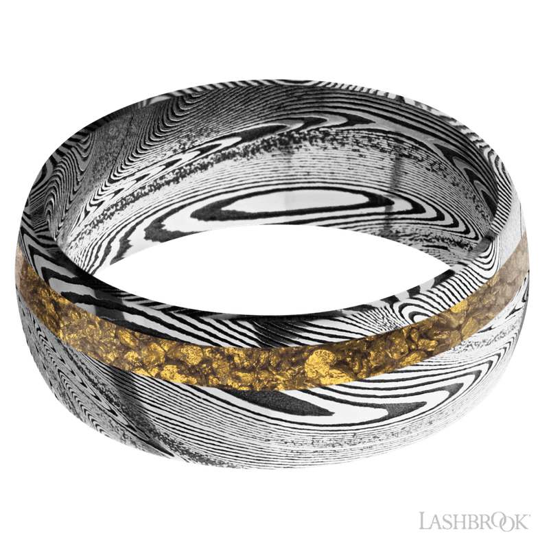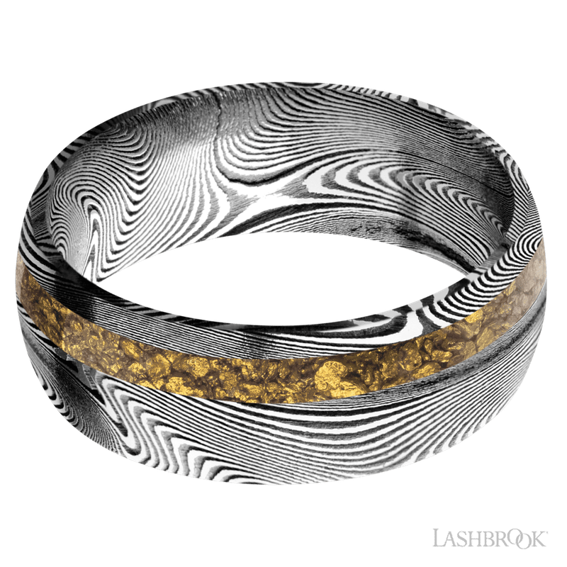 8 mm wide/Domed/Tightweave band with one 2 mm Off Center inlay of Alaskan Gold Nugget.