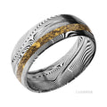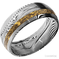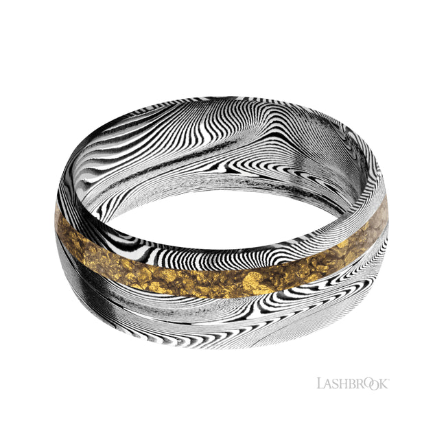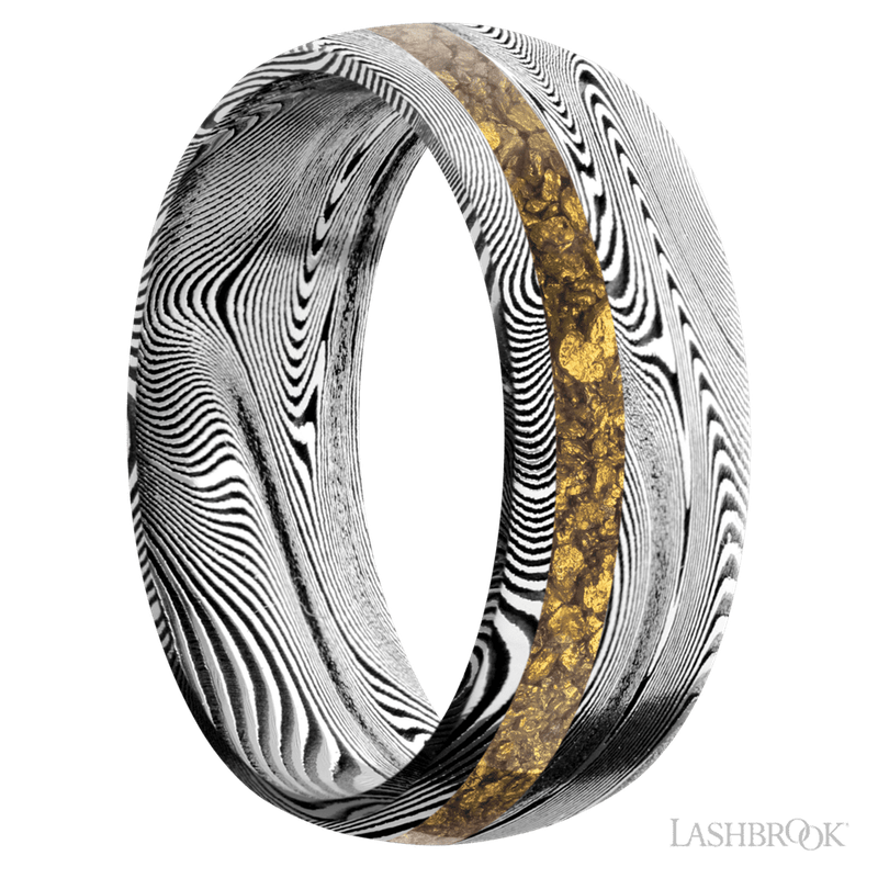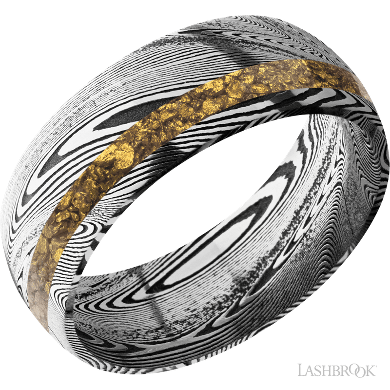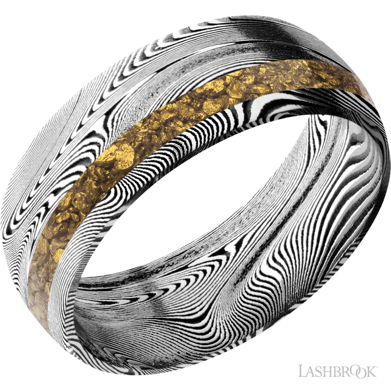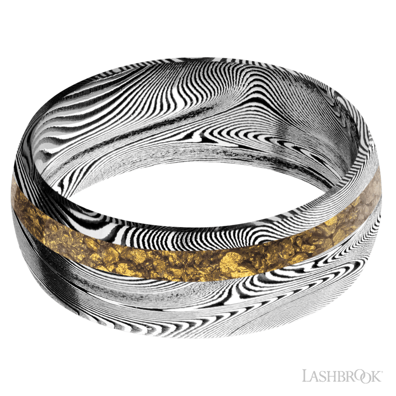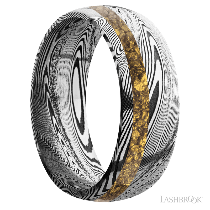 8 mm wide/Domed/Tightweave band with one 2 mm Off Center inlay of Alaskan Gold Nugget.