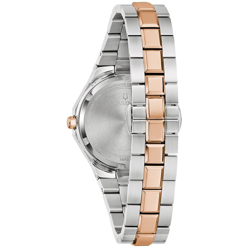 Bold, elevated design characterizes this Classic Bulova Prestige women’s timepiece that balances bold design with an elegant presence. The watch features a faceted 32mm rose gold- and silver-tone stainless steel case with a geometric bezel, flat sapphire crystal with anti-reflective coating, 100m of water resistance, and a chamfered 3-link bracelet with brushed and polished finishes and a push-button deployant closure. The lustrous mother-of-pearl dial has rose gold-tone hands and applied markers with Super-LumiNova luminescent fill, 8 dazzling diamonds, and a date display. Striking in both its modernity and its sophistication, this Bulova ladies’ watch is an ideal companion on any wrist.