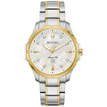 From the legendary Bulova Marine Star collection, this sporty and elegant ladies’ timepiece offers unrivaled style. The gold and silver-tone stainless steel case features a modern design with a bold crenellated fixed bezel and symmetrical case flanks. A flat sapphire crystal and protected crown provide modern reliability which is furthered by 100m of water resistance. The iridescent mother-of-pearl dial adds a captivating twist to the timepiece, with eight diamond hour markers and a refined gold-tone handset with luminescent fill for superb legibility in all conditions. The watch is paired with a matching two-tone quick-release stainless steel bracelet with a push-button deployant closure that provides both comfort and security. For timeless elegance no matter the occasion, this Bulova ladies’ timepiece makes the perfect companion.