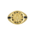 Statement ring in polished 14K gold-plated sterling silver features a raised image of Chronos, the god of time, holding an hourglass and encircled by Roman numerals on a clock. Accented on both sides with a vertical inlay of black diamonds totaling 0.10 CTTW. Interior design inspired by Bulova's iconic tuning fork logo. Ring top measures 16MM in diameter. Size 11.