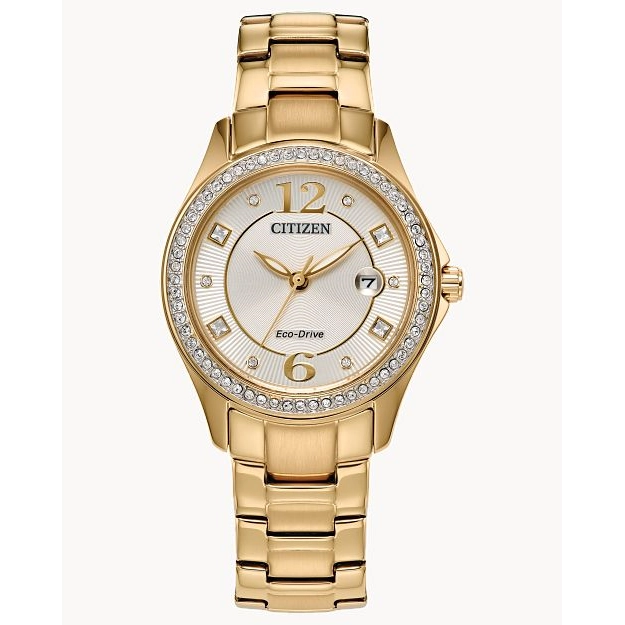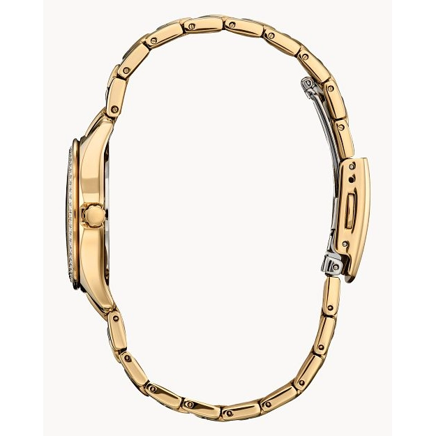 A shimmering statement is made with the newest addition to the Crystal collection. This elegant timepiece shines bright with 70 crystals surrounding the gold-tone stainless steel case and champagne 3-hand dial and has a gold-tone stainless steel bracelet fastened with a fold over clasp. Featuring our Eco-Drive technology that’s sustainably powered by any light and never needs a battery, this fashionable watch will add sparkle to your day-to-evening look and a modern elegance to your wrist.