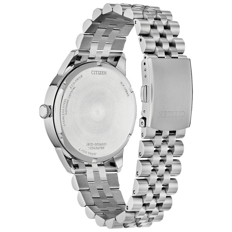 This vintage-inspired timepiece is a paragon of timeless elegance. With a 40.5mm, silver-tone stainless steel case and matching five-link bracelet, the new Rolan features a blue dial with a gradient effect. Applied silver-tone accents and Arabic numerals at the quarter hours add to its charm, while day and date indicators on opposite sides of the top and bottom of the dial place the watch firmly in the realm of retro-style. The watch features Citizen's Eco-Drive technology – sustainably powered by light, any light, and never needs a battery. Water resistant to 100 meters. Caliber J800.