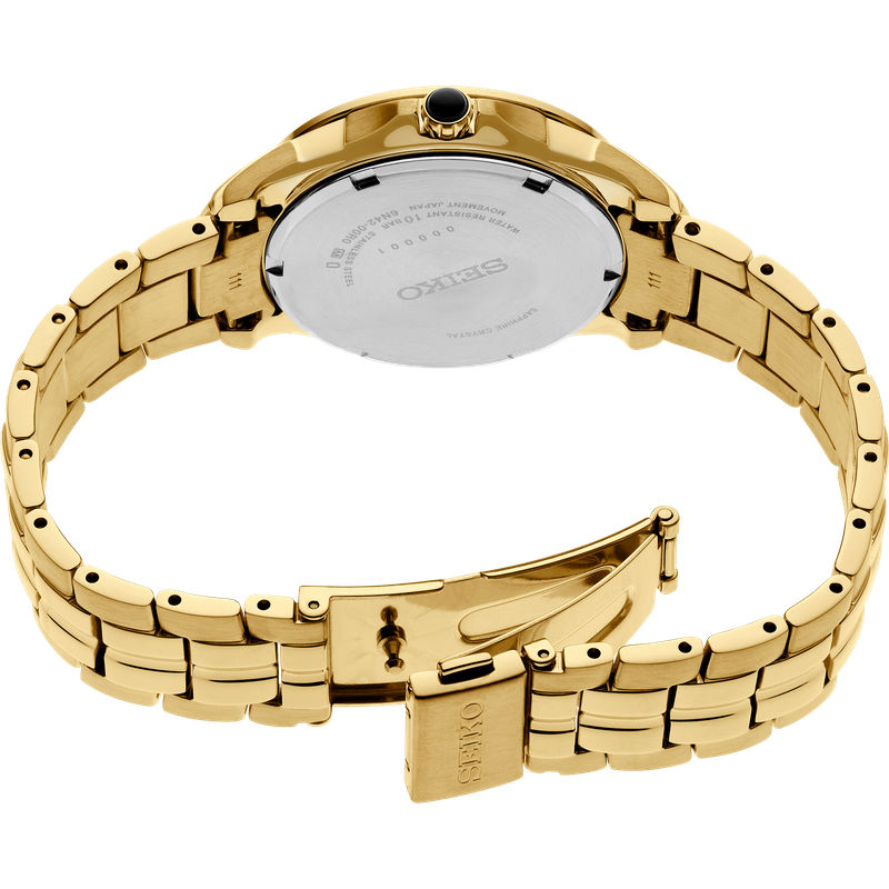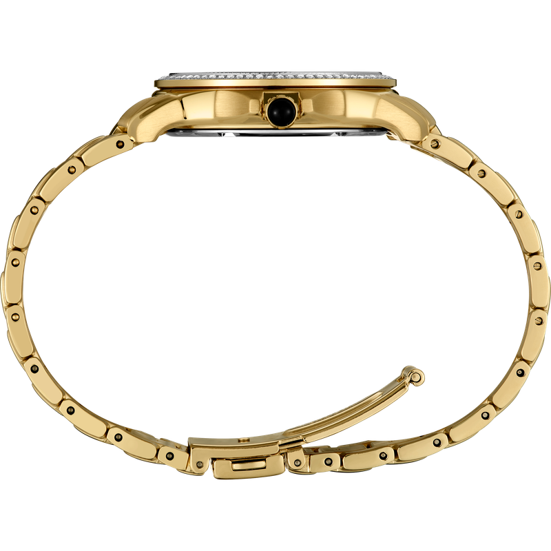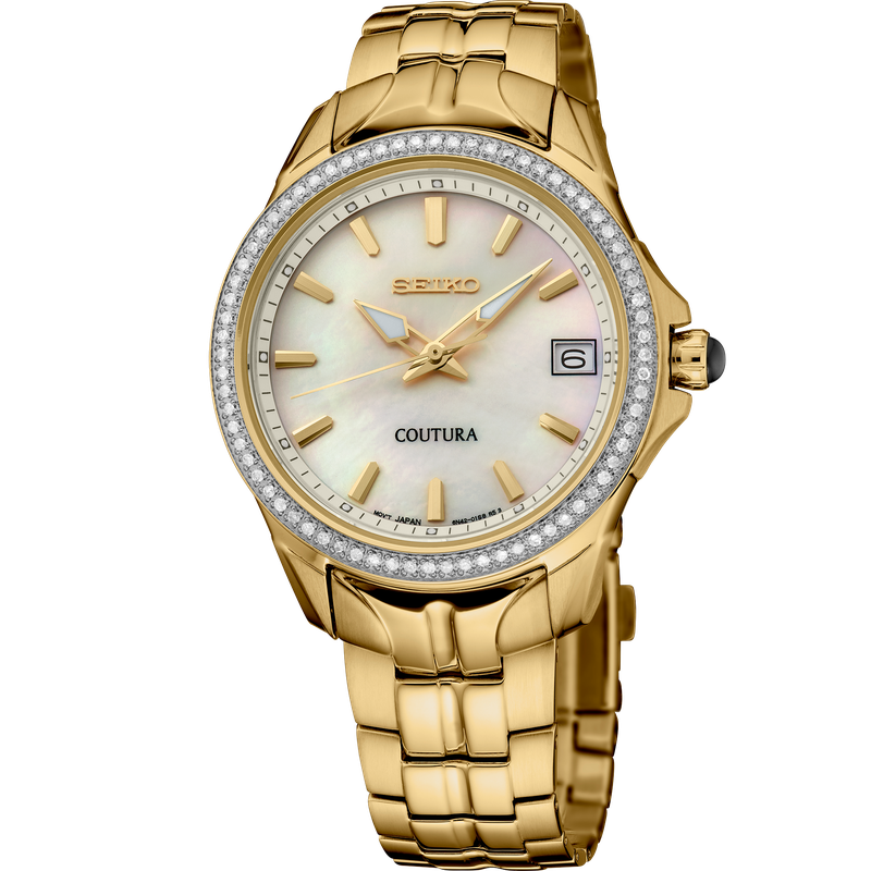 From the Coutura Collection. Expressing a polished and modern sophistication, the Coutura Collection combines bold angularity and elegant design with superior timekeeping for effortless sport/dress aesthetic. This versatile timepiece, perfect for day-to-night style, features a diamond bezel for a touch of luxury and a classic white mother-of-pearl dial with gold applied indices, adding a rich 3-dimensional appearance to the elegant look. Crafted of stainless steel, with 72 diamonds adorning the bezel and a perfectly proportioned case and bracelet for a streamlined fit, this graceful watch is topped with a scratch-resistant sapphire crystal and includes LumiBrite hands and markers, a date calendar, a classic cabochon crown, and a tri-fold push-button release clasp. 10 bar, 100M Water Resistant