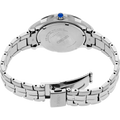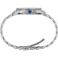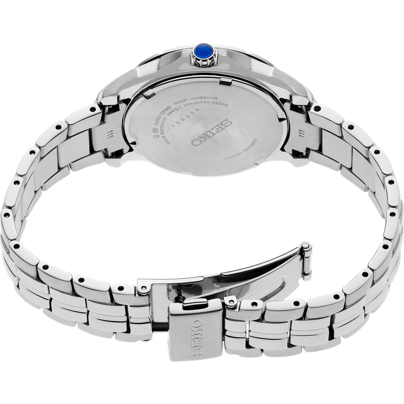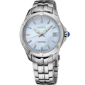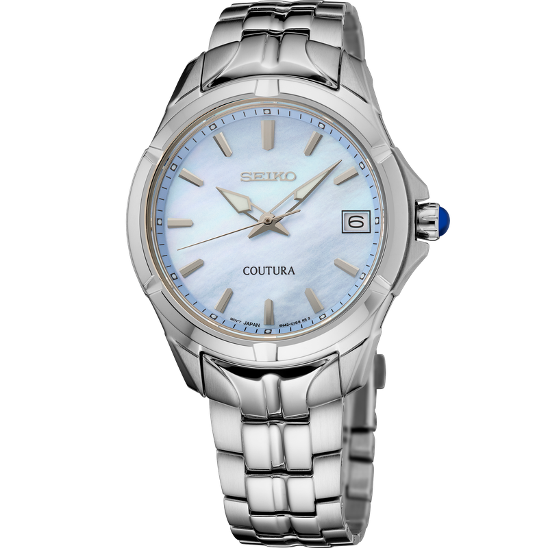 From the Coutura Collection. Expressing a polished and modern sophistication, the Coutura Collection combines bold angularity and elegant design with superior timekeeping for an effortless sport/dress aesthetic. This versatile timepiece, perfect for day-to-night style, features a shimmering pale blue mother-of-pearl dial with silver applied indices, adding a rich 3-dimensional appearance to the elegant look. Crafted of stainless steel, with a perfectly proportioned case and bracelet for a streamlined fit, this graceful watch is topped with a scratch-resistant sapphire crystal and includes LumiBrite hands and markers, a date calendar, a classic cabochon crown, and a tri-fold push-button release clasp. 10 bar, 100M Water Resistant