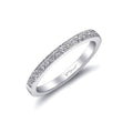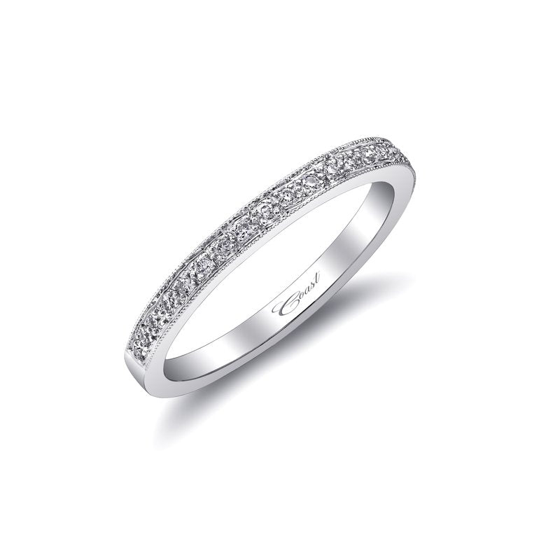 This wedding band from the Romance Collection features fine pave set diamonds and milgrain detailing across the top half of the ring.