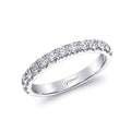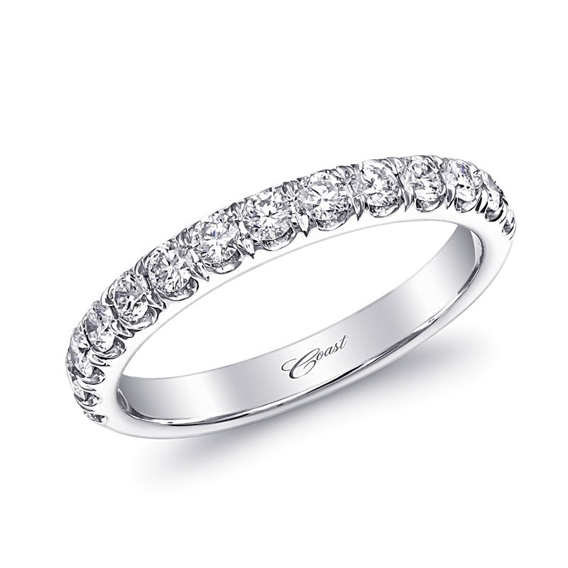 A beautiful wedding band featuring fishtail set round brilliant diamonds across the top half of the band.