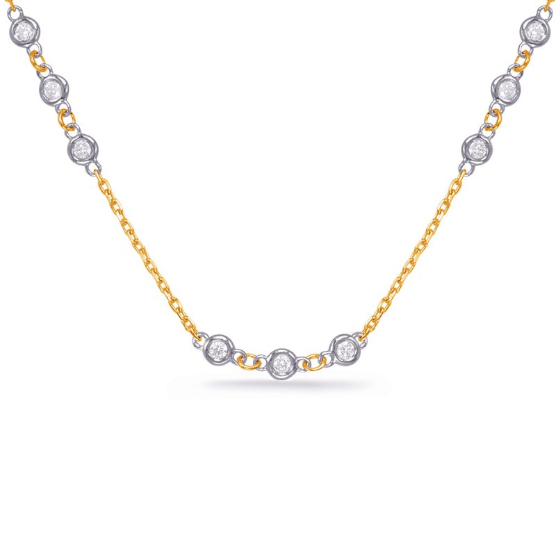 This Necklace is available in 14K Yellow & White Gold. There are a total of 30 stones. There are Rounds with a total carat weight of 0.64 set in a setting.