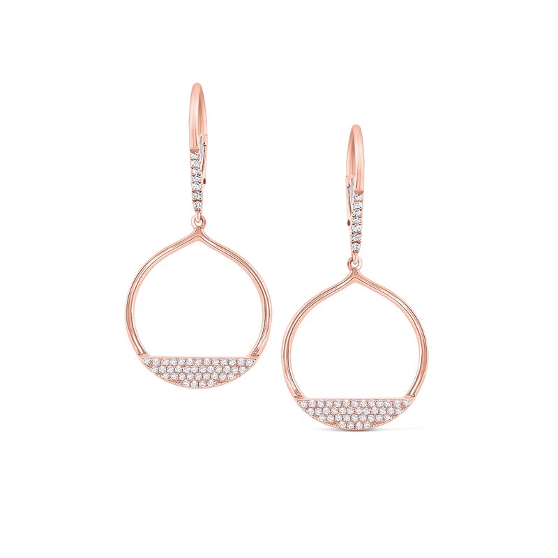 These round frame earrings feature a fun & modern accent of diamonds at the bottom and in a line on top. 90 shining diamonds, weighing 0.25ct tw set in 14 Kt. rose gold make up the perfect accessory for any hairstyle.