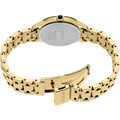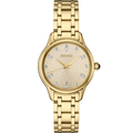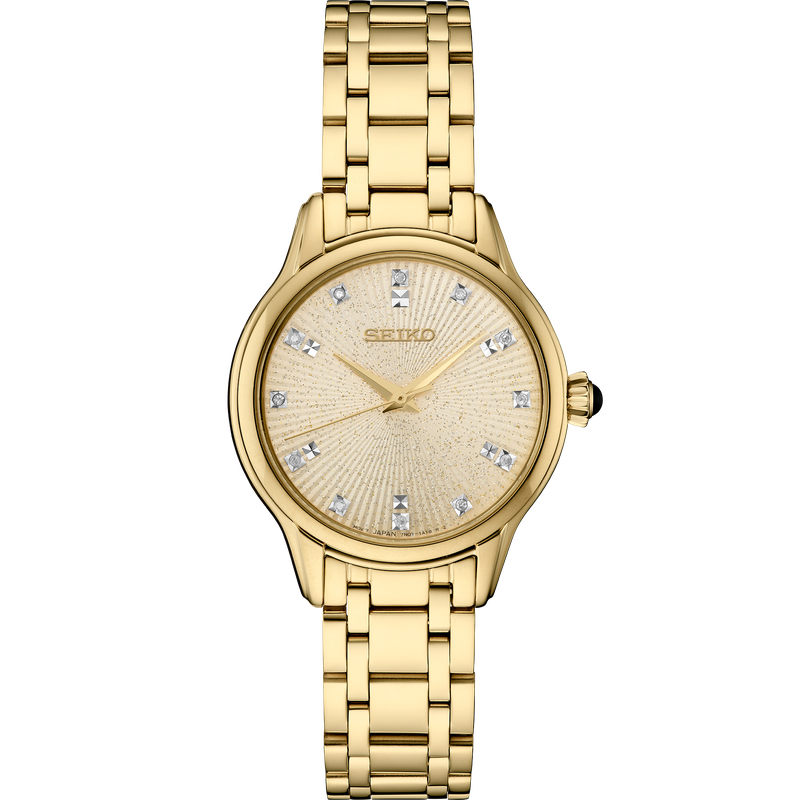 From the Diamond Collection. Elegantly streamlined, this sparkling design features 12 diamonds set on a subtly shimmering champagne dial with a pressed pattern and glitter finish. Crafted of stainless steel, in a rich gold finish, this graceful watch includes a scratch-resistant sapphire crystal, classic cabochon crown, and tri-fold push button release clasp. 5 bar, 50M Water Resistant