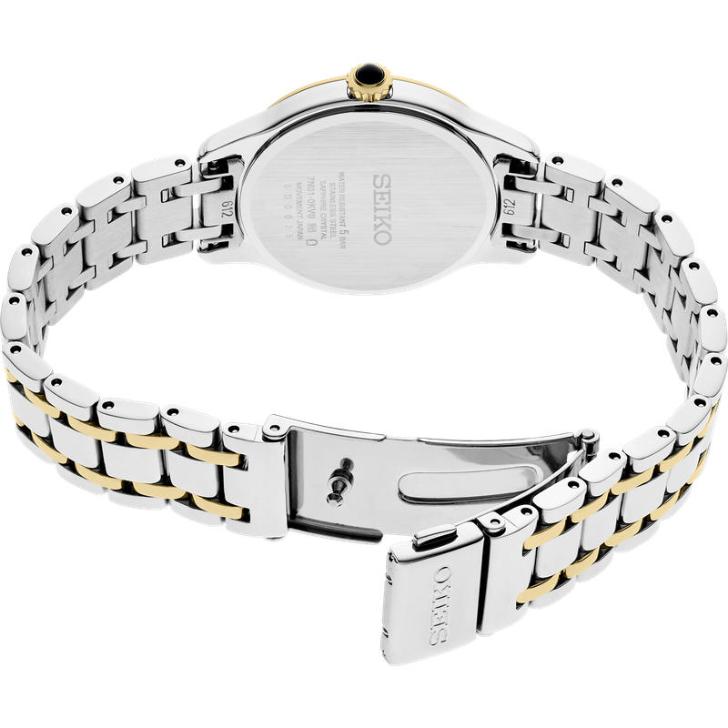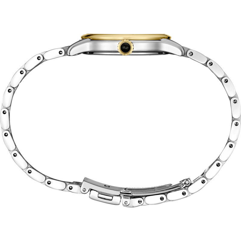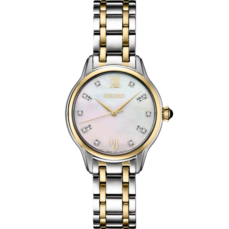 From the Diamond Collection. With elegant simplicity, this beautifully balanced design, perfect for dress or everyday wear, features a shimmering mother-of-pearl dial set with 10 diamonds. Crafted of stainless steel in a versatile two-tone finish, this graceful watch offers slim lines for wearing comfort and includes a scratch-resistant sapphire crystal and classic cabochon crown. 5 bar, 50M Water Resistant