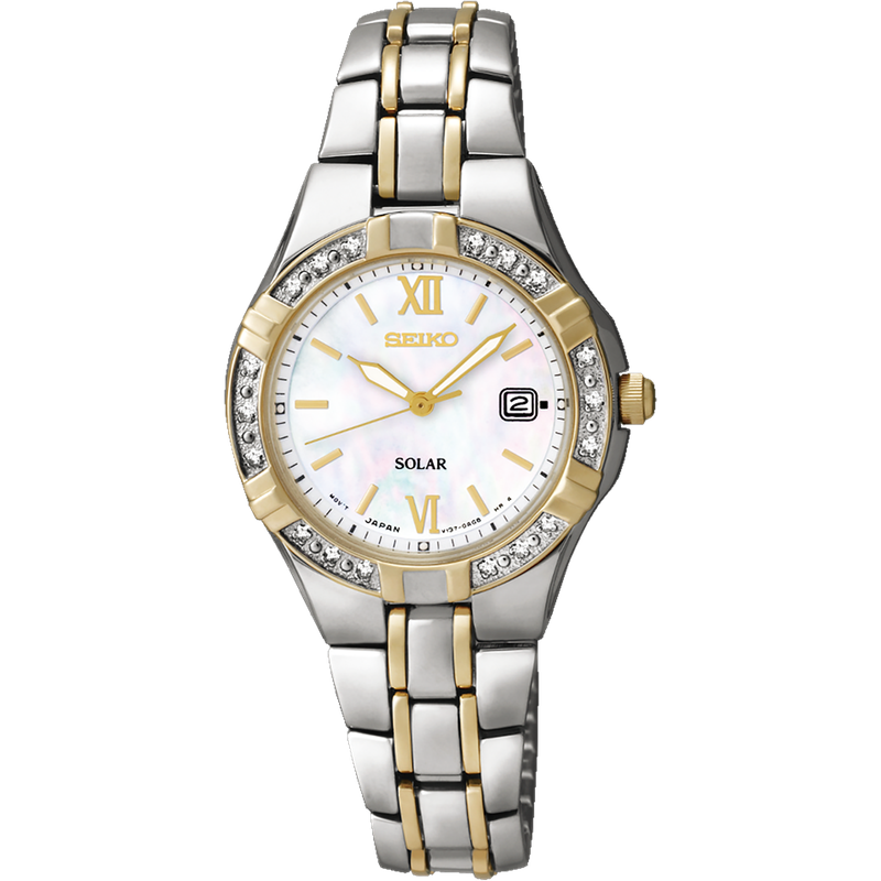 Seiko Solar with diamonds. No battery change required and powered by all types of light. Solar cell with high performance electricity generation. Energy-efficient movement with long power reserve. This dress watch has a two-tone stainless steel case and bracelet with mother-of-pearl dial which creates an elegant finish. The timepiece is finished with 18 diamonds around the bezel. Date calendar. 100 meters water resistant.