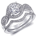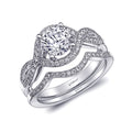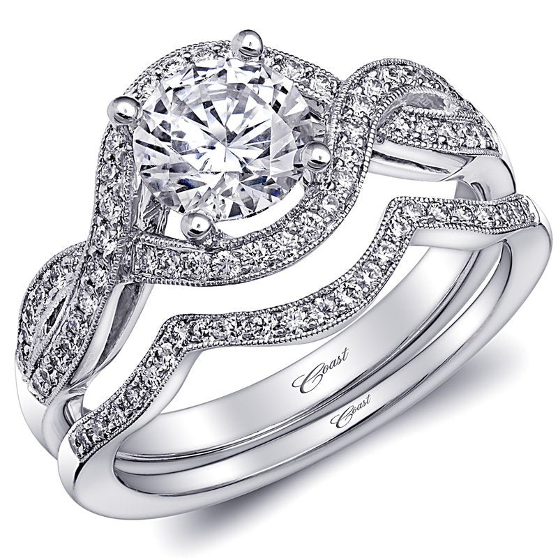 Fine pave set diamonds weave around a 1 ct center stone in this elegant engagement ring. Shown with a contoured matching band. Band sold separately.