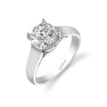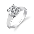 A timeless design, this solitaire engagement ring is made for a 1.5 ct round center stone and is held in place by a row of petite diamonds under the head, accented by fine milgrain. 18K white gold.