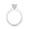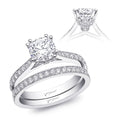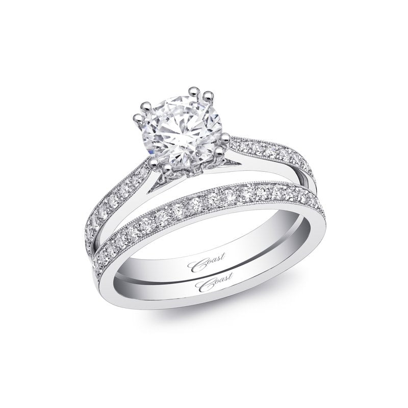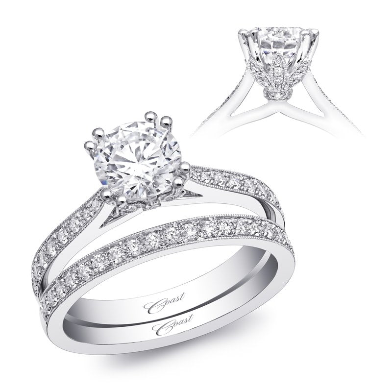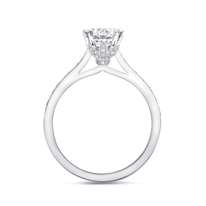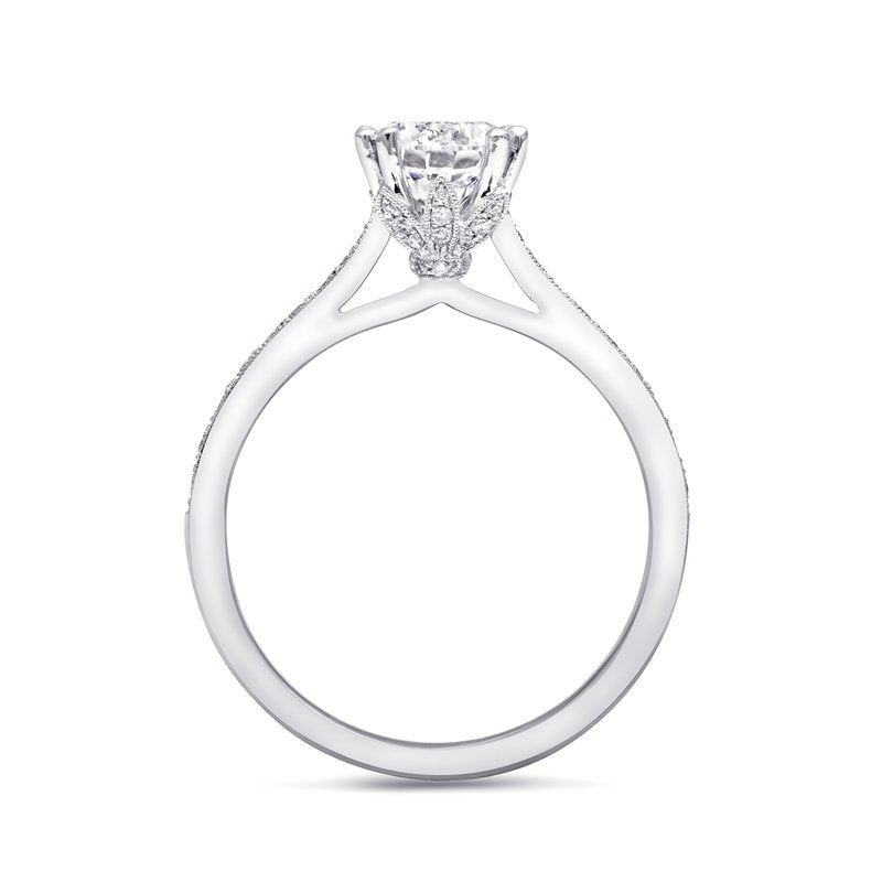 A gorgeous design from the Romance Collection, this ring features diamond encrusted petals which cradle the center stone. Fine pave diamonds on the shoulders of the ring add extra sparkle.Created for a 1 ct center stone. Band sold separately.