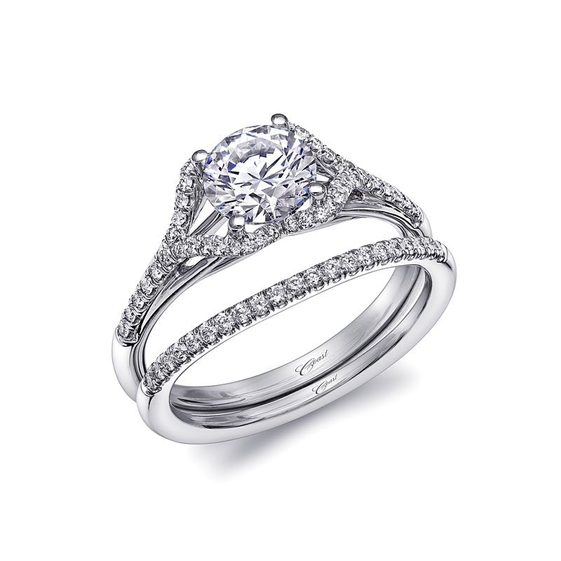 This unique engagement ring features an open diamond halo which tapers into a row of diamonds on the shank. Shown with a 1 ct center stone. Band sold separately.