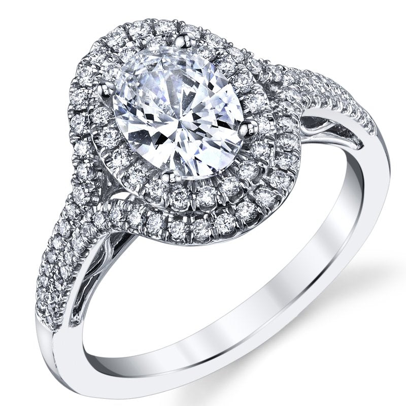 This stunning design features two rows of fishtail set diamonds. The band splits to surround a gorgeous diamond halo which lead the eye to an oval center stone. Graceful ornate designs accentuate the gallery. Shown with a 1 ct center stone.