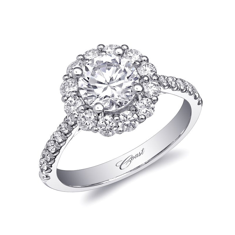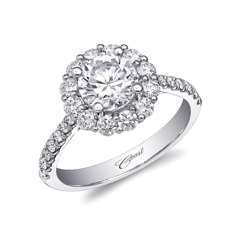 This beautiful round halo engagement ring will surely stand the test of time. Shown with a 1 ct center stone.
