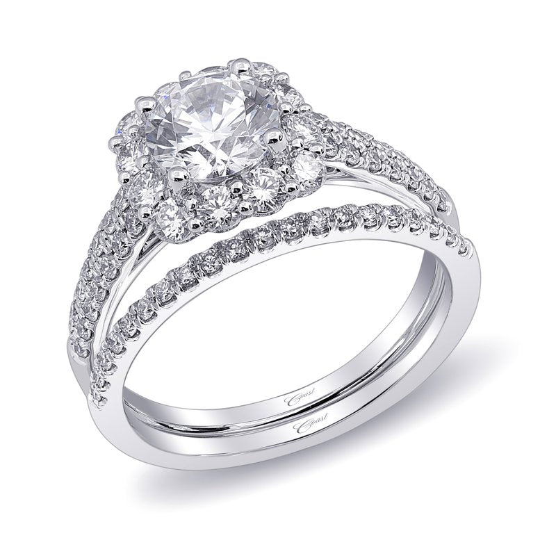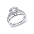 A glittering engagement ring with a sumptuous diamond halo and double row diamond shank. Shown with a 1 ct round center stone. Band sold separately.