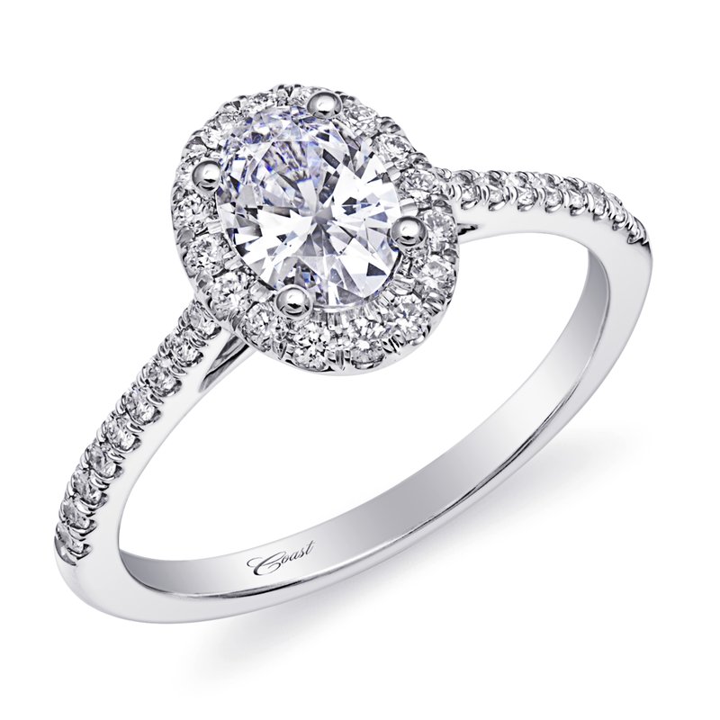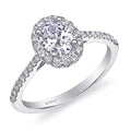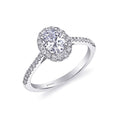 An elegant engagement ring featuring an oval diamond halo and delicately set diamonds on the shoulders. Shown with an 1 ct oval center stone.