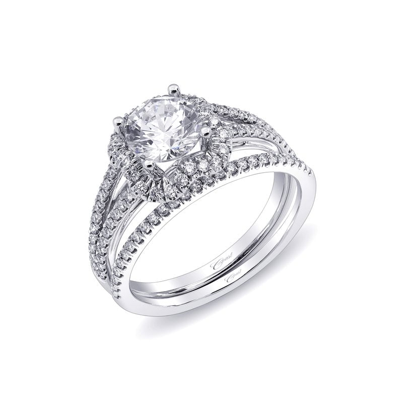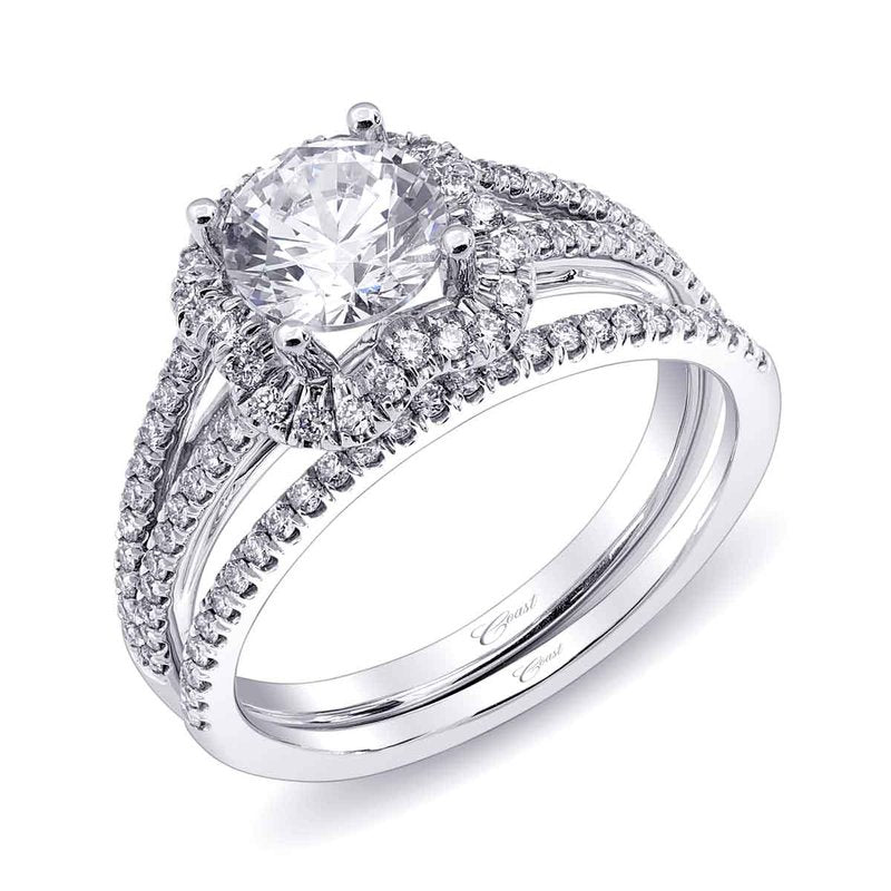 This unique engagement ring features a 1 ct center stone framed by an ornate halo and split shank encrusted in diamonds. Band sold separately.